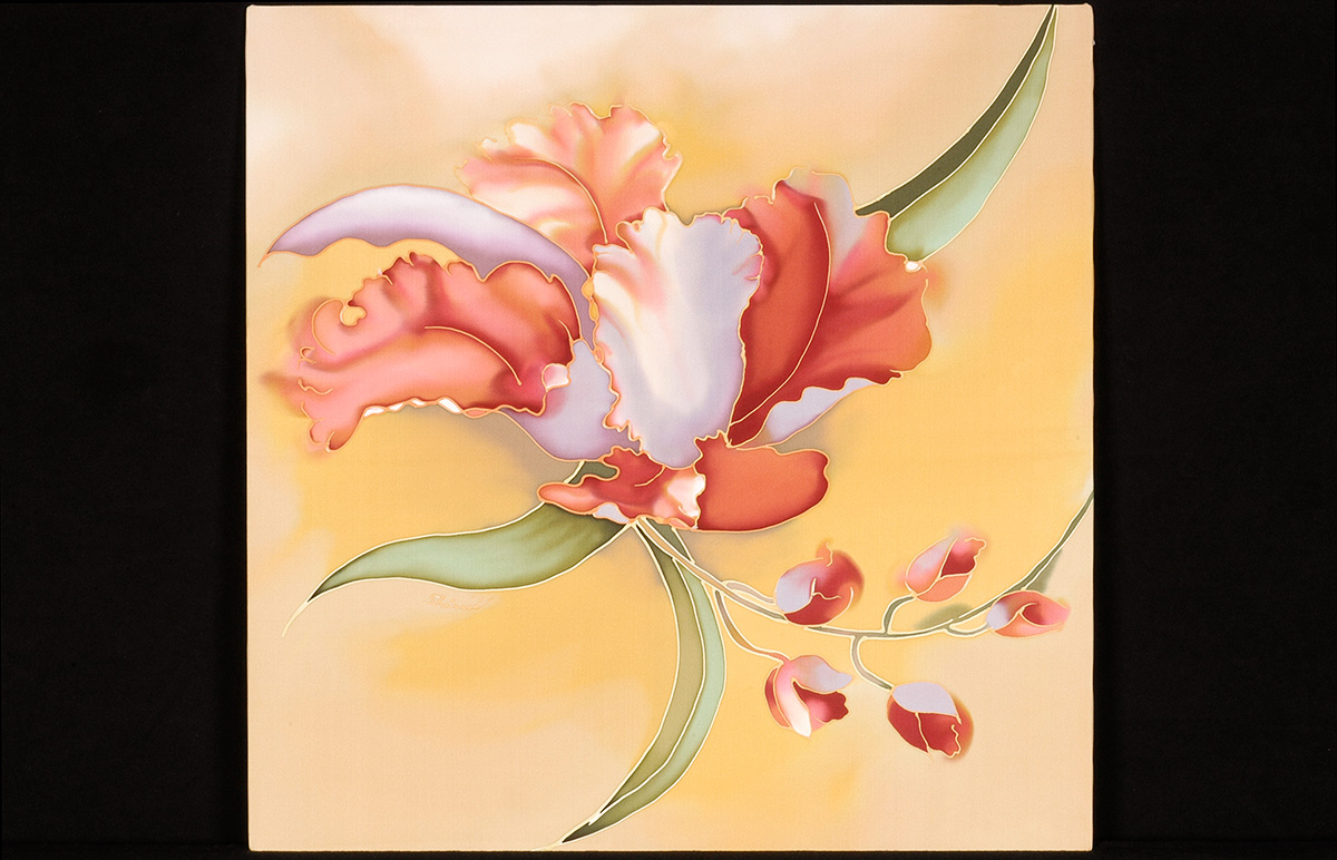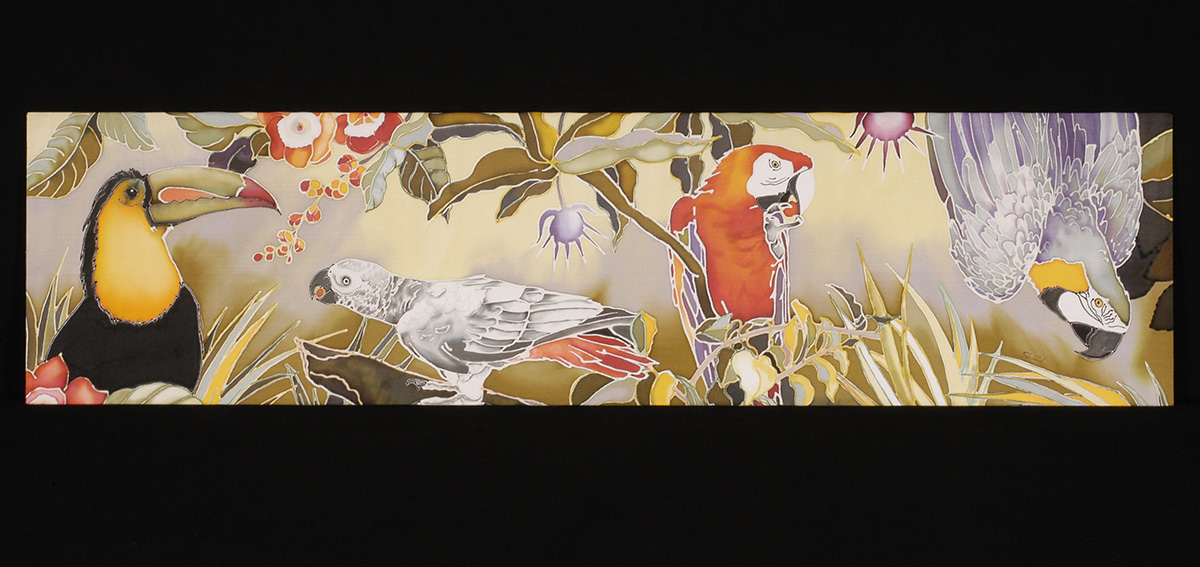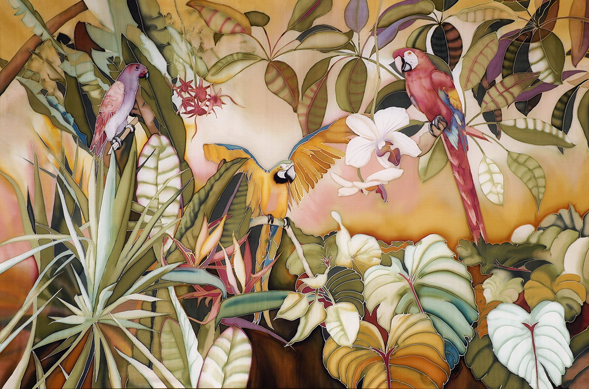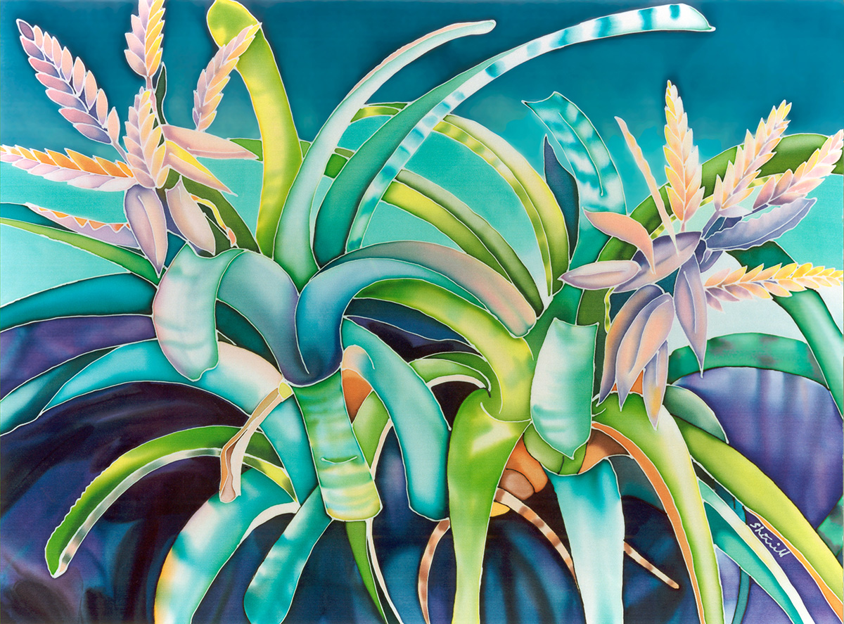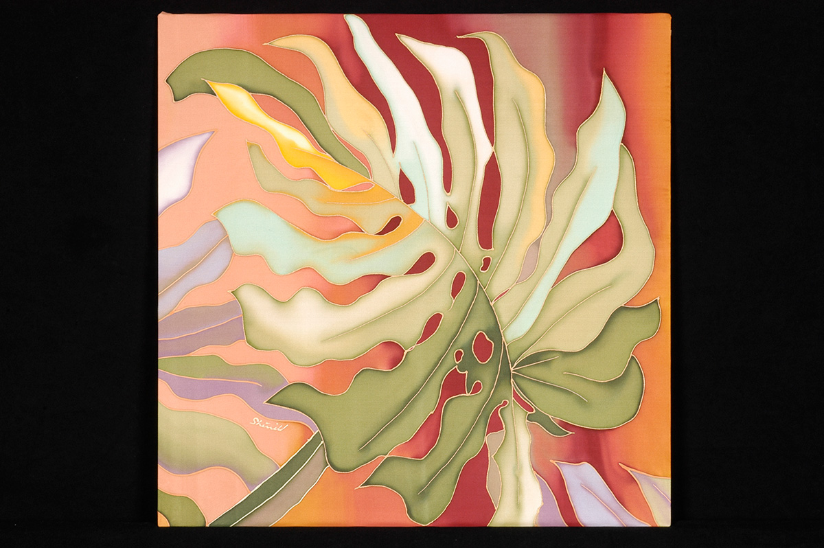 My medium is dye on silk, incorporating wax and gutta as resists. I employ the natural luminosity of the silk to infuse my paintings with light.
