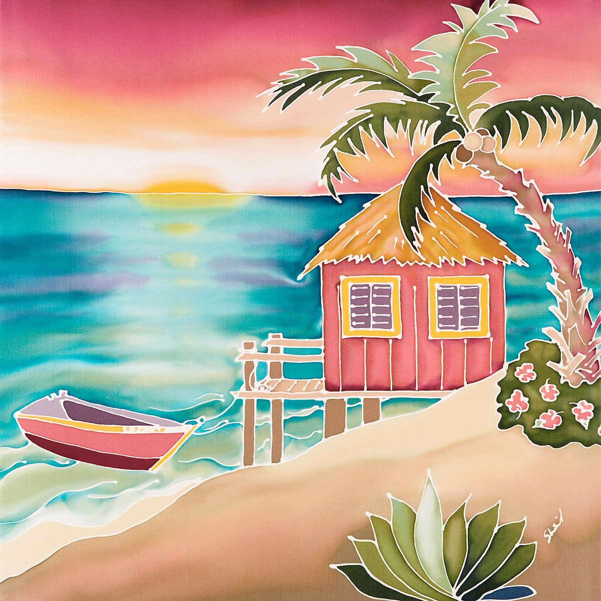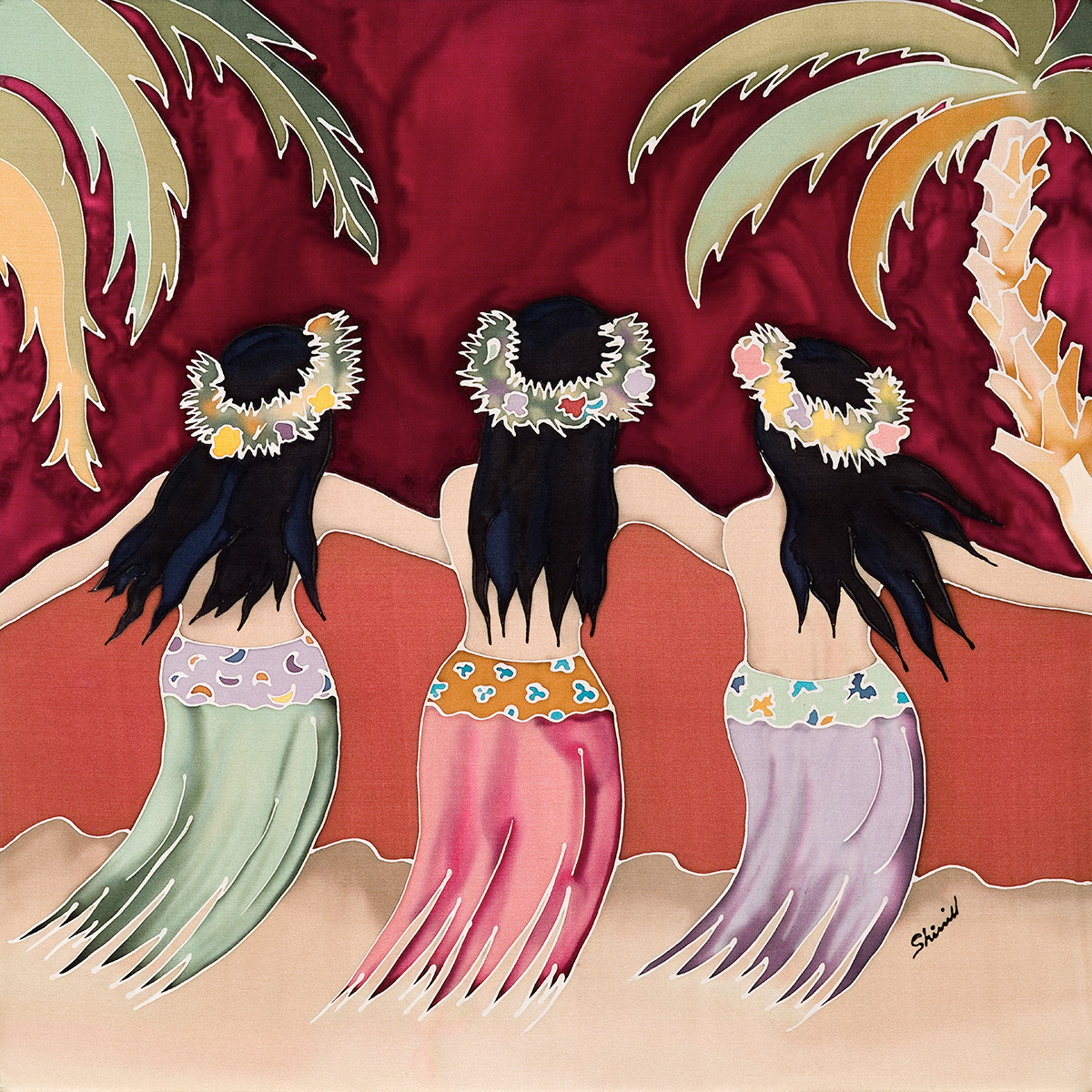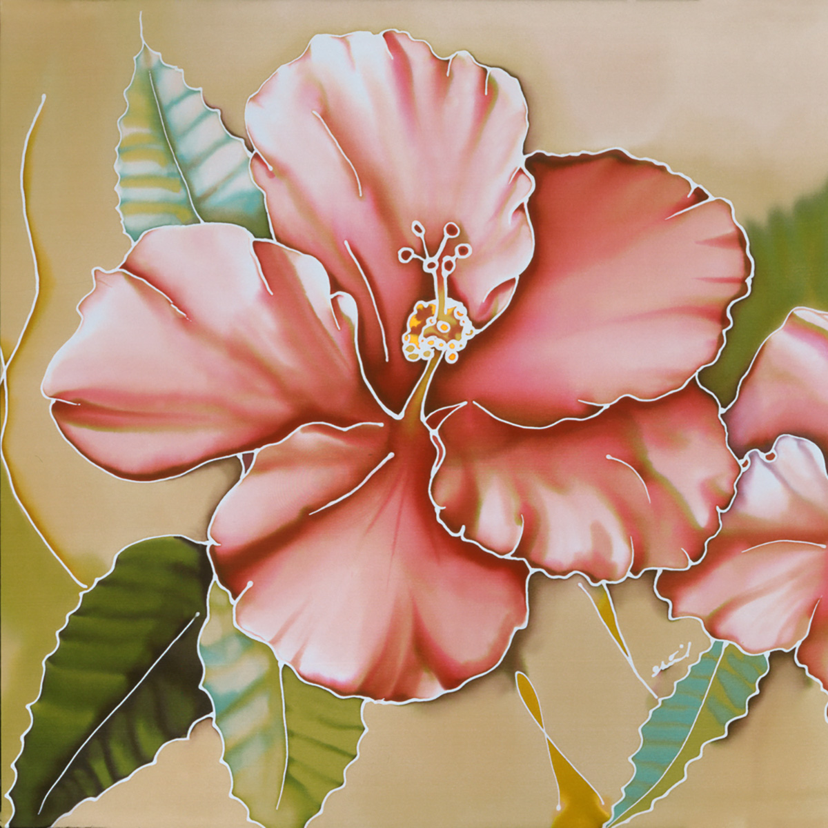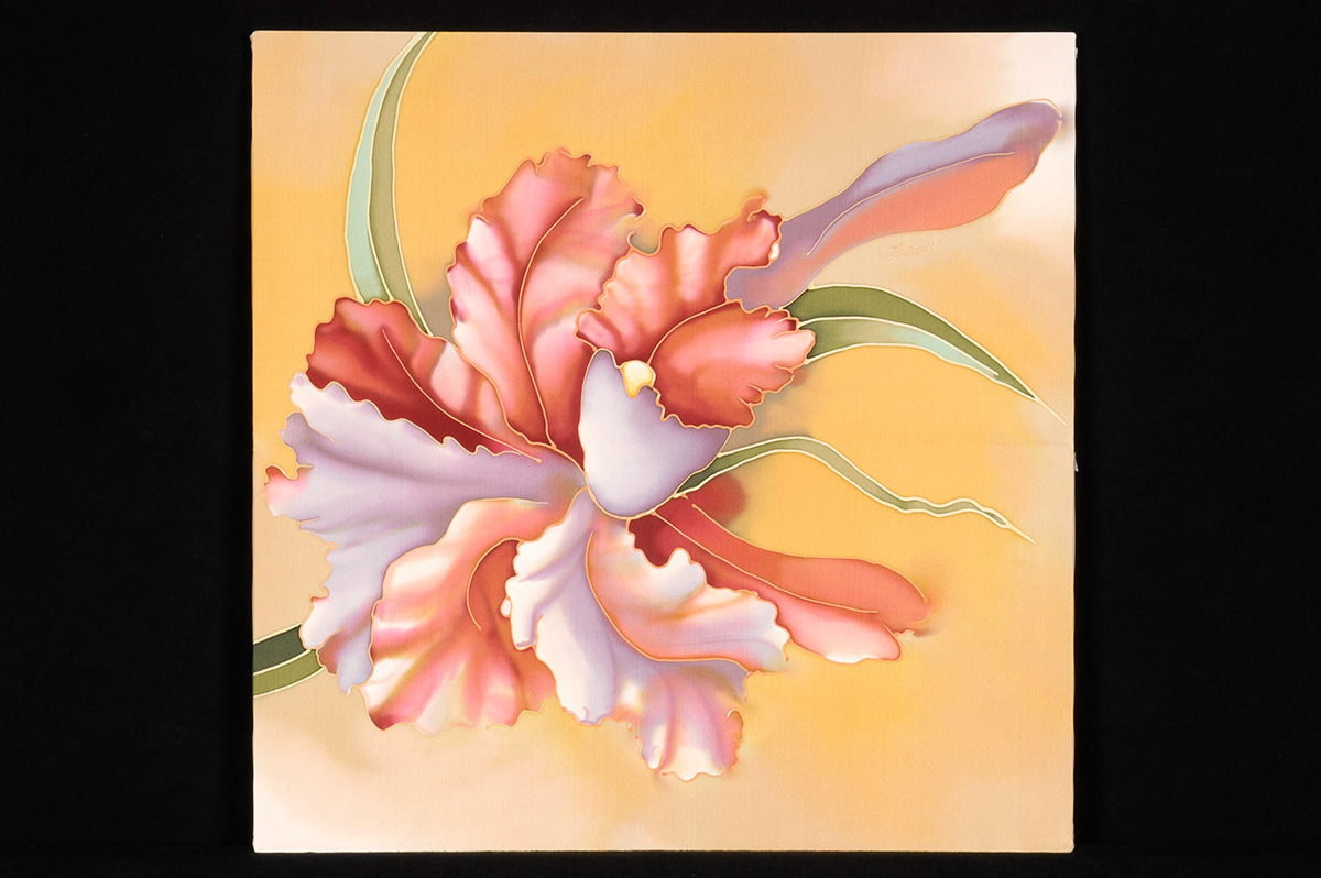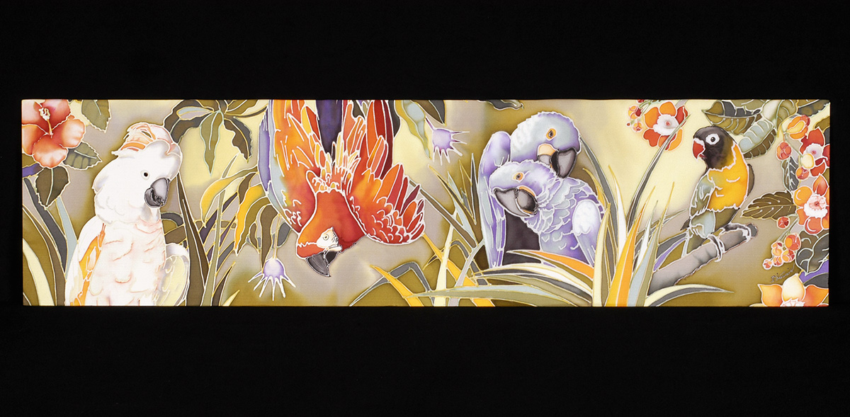 My medium is dye on silk, incorporating wax and gutta as resists. I employ the natural luminosity of the silk to infuse my paintings with light.